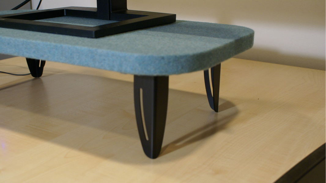 Om de keuze te hebben tussen laptopstandaard of beeldscherm verhoger is een handig pootje ontworpen uit plaatstaal dat op twee manieren gemonteerd kan worden. Zie hiervoor het filmpje onderaan deze pagina. .